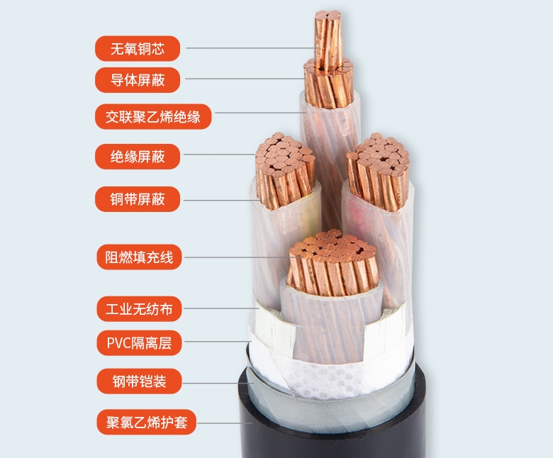 (1)阻燃电力电缆。普通电缆的绝缘资料有一个共同的缺点,便是具有可燃性。当线路中或接头处产生毛病时,电缆或许因局部过热而焚烧,并导致扩展事故。阻燃电缆是在电缆绝缘或护层中添加阻燃剂,即便在明火烧烤下,电缆也不会焚烧。阻燃电力电缆的结构与相应的普通聚氯乙烯绝缘电力电缆和交联聚乙烯绝缘电力电缆的结构基本上相同,而用料有所不同。关于交联聚乙烯绝缘电力电缆,其填充物(或填充绳)、绕包层内衬层及外护套等,均在原用资料中加入阻燃剂,以阻止延燃;有的电缆为了下降电缆火灾的毒性,电缆的外护套不必阻燃型聚氯乙烯,而用阻燃型聚烯烃资料。关于聚氯乙烯绝缘电力电缆,有的选用加阻燃剂的方法,有的则选用低烟、低卤的聚氯乙烯料作绝缘,而绕包层和内衬层均用无卤阻燃料,外护套用阻燃型聚烯烃资料等。至于选用哪一种型式的阻燃电力电缆,要根据运用者的具体情况进行挑选。